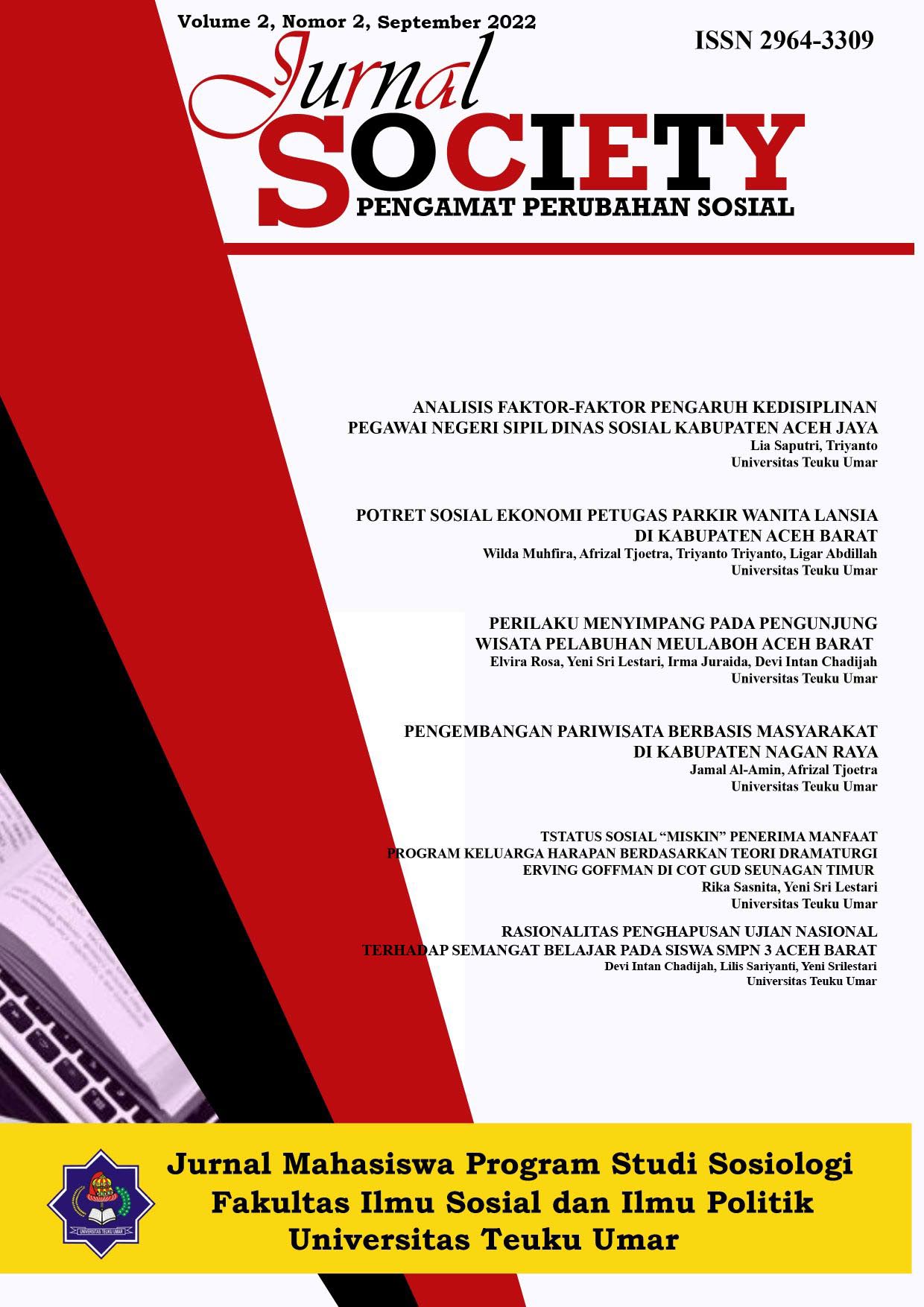| Vol 2, No 2 (2022) | ANALISIS FAKTOR-FAKTOR PENGARUH KEDISIPLINAN PEGAWAI NEGERI SIPIL DINAS SOSIAL KABUPATEN ACEH JAYA | Abstract PDF |